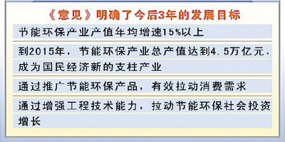 《意见》指出,加快发展节能环保产业要围绕提高产业技术水平和竞争力,以企业为主体、以市场为导向、以工程为依托,强化政府引导,完善政策机制,培育规范市场,着力加强技术创新,大力提高技术装备、产品和服务水平,以释放市场潜在需求,形成新的增长点,为稳增长、调结构、扩内需,改善环境质量,保障和改善民生,推动加快生态文明建设作出贡献。