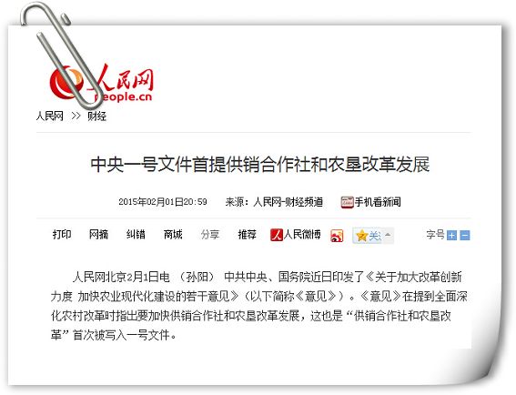 中共中央、国务院近日印发了《关于加大改革创新力度 加快农业现代化建设的若干意见》(以下简称《意见》)。《意见》在提到全面深化农村改革时指出要加快供销合作社和农垦改革发展,这也是“供销合作社和农垦改革”首次被写入一号文件。