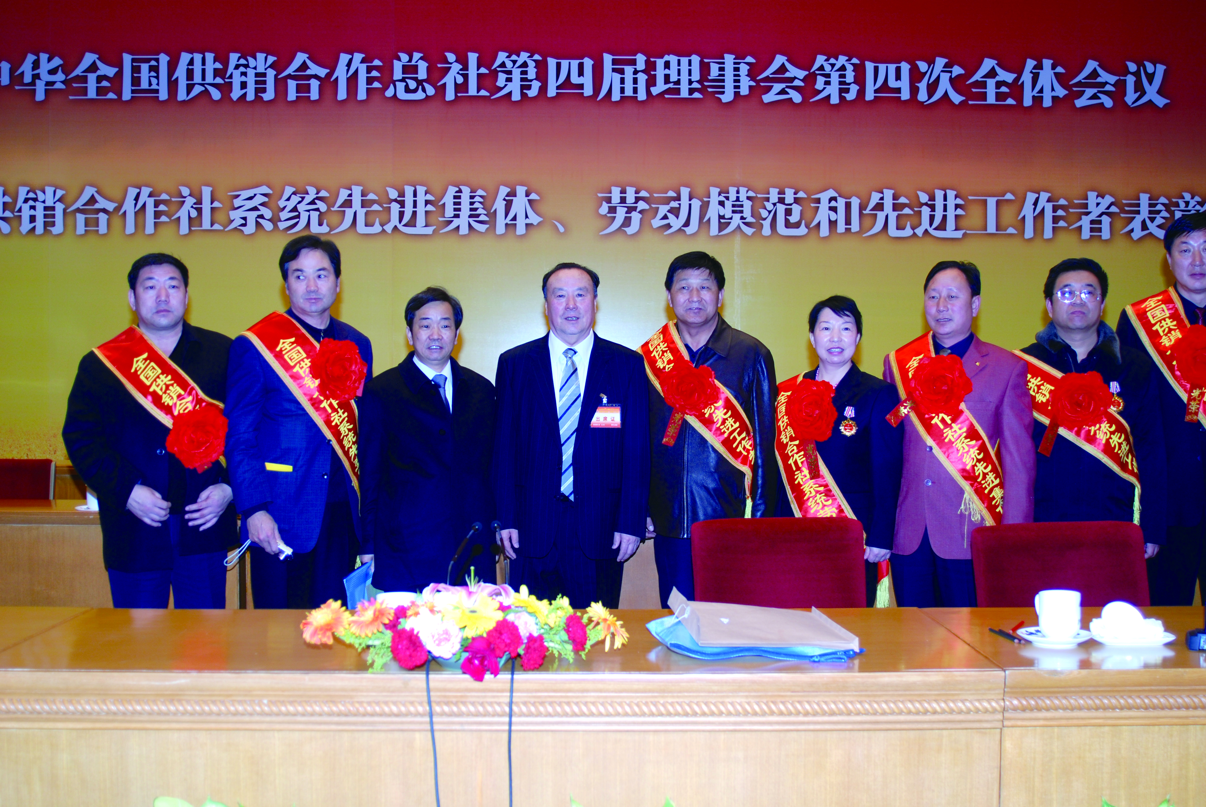 2008年1月,时任全国政协副主席白立忱(左四)与获得中华全国供销合作总社表彰的内蒙古供销合作社先进集体代表、先进个人合影