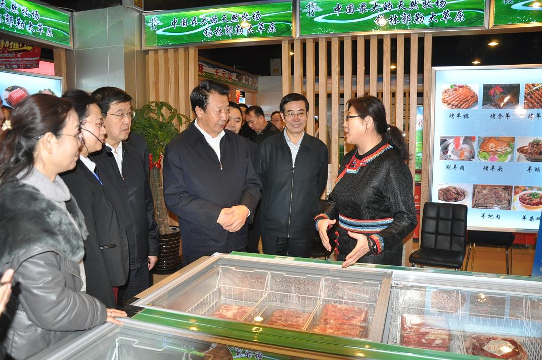 2014年12月,时任内蒙古自治区党委书记王君(右3)、自治区主席巴特尔(右4)到北京市内蒙古绿色农畜产品广场进行调研指导