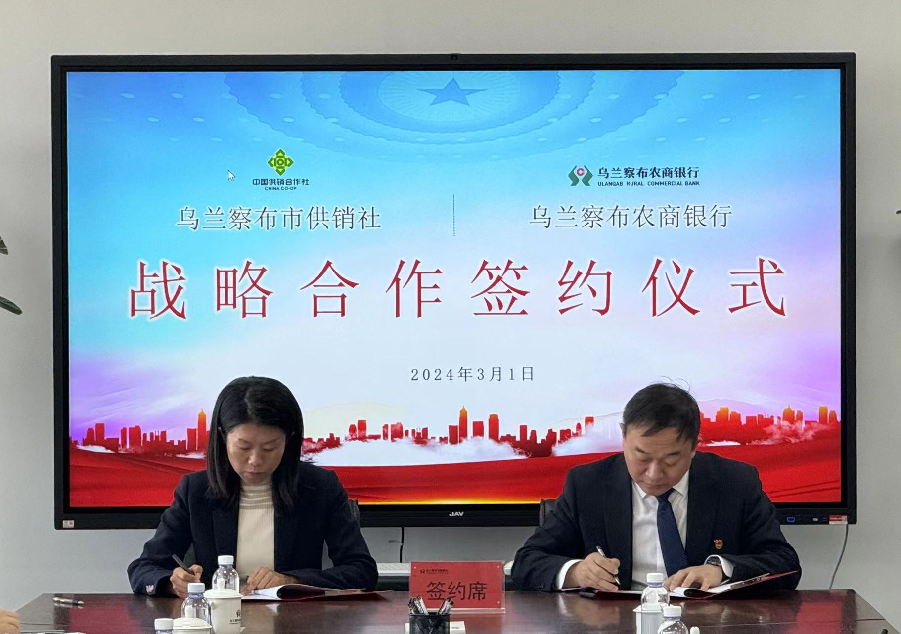 2024年3月1日上午,乌兰察布市供销合作社联合社与乌兰察布农商银行举行战略合作签约仪式。乌兰察布市供销合作社党组书记郭翔宇和乌兰察布农商银行党委书记、董事长刘先丰分别致辞。乌兰察布市供销合作社联合社理事会主任张玉娟与乌兰察布农商银行党委副书记、行长李金龙代表双方签署战略合作协议。