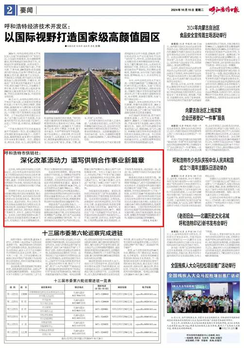 近日,《呼和浩特日报》要闻版刊发深化改革专题文章《呼和浩特市供销社:深化改革添动力 谱写供销合作事业新篇章》,文中着重报道了呼和浩特市供销社深化改革方面的成效。