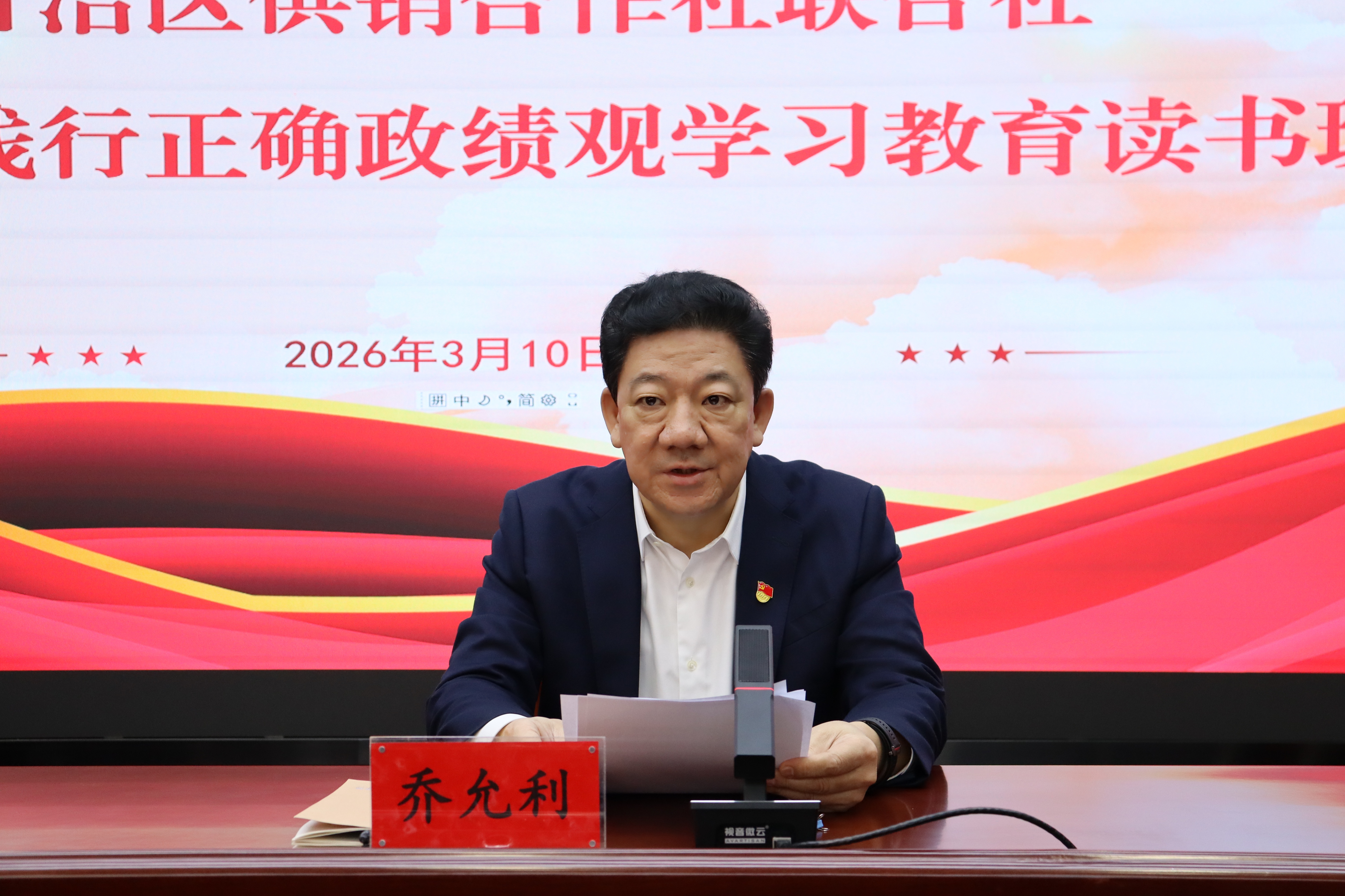 2026年3月10日至11日,自治区供销合作社联合社(以下简称区社)利用2天的时间举办树立和践行正确政绩观学习教育读书班,区社党组书记、理事会主任乔允利主持开班仪式并讲话,区社在家的领导班子成员参加。