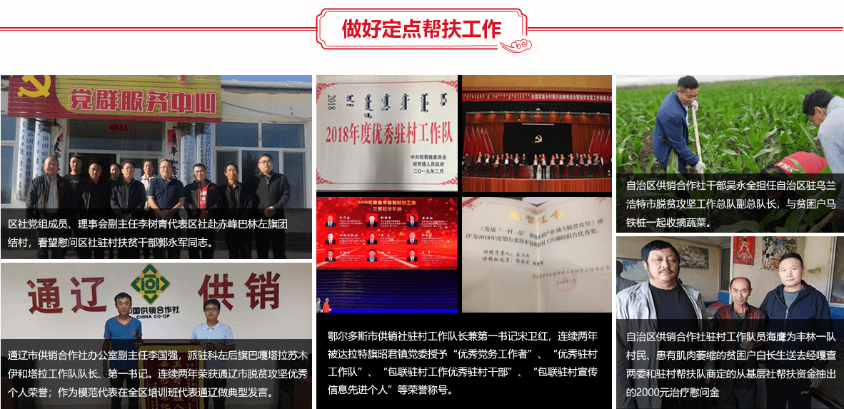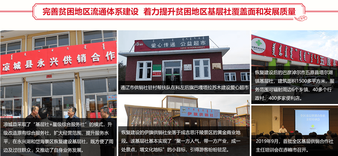 根据中央、自治区党委和中华全国供销合作总社有关打赢脱贫攻坚战的工作部署,2017年以来,自治区供销合作社将精准扶贫和供销合作社自身业务工作紧密结合,充分发挥供销合作社行业特点和系统优势,从消费扶贫、流通体系建设、综合服务帮扶、电子商务扶贫、定点帮扶等方面,为打赢脱贫攻坚战发挥应有作用,努力成为党和政府做好“三农三牧”工作的重要载体和扶贫开发工作的重要抓手。2019年前三季度,全区贫困旗县供销合作社累计实现销售总额 121.12亿元,同比增长12.46%;累计实现购进总额110.97亿元,同比增长11.80%,其中,累计从农业生产者购进农畜产品65.55亿元,同比增长18.02%。